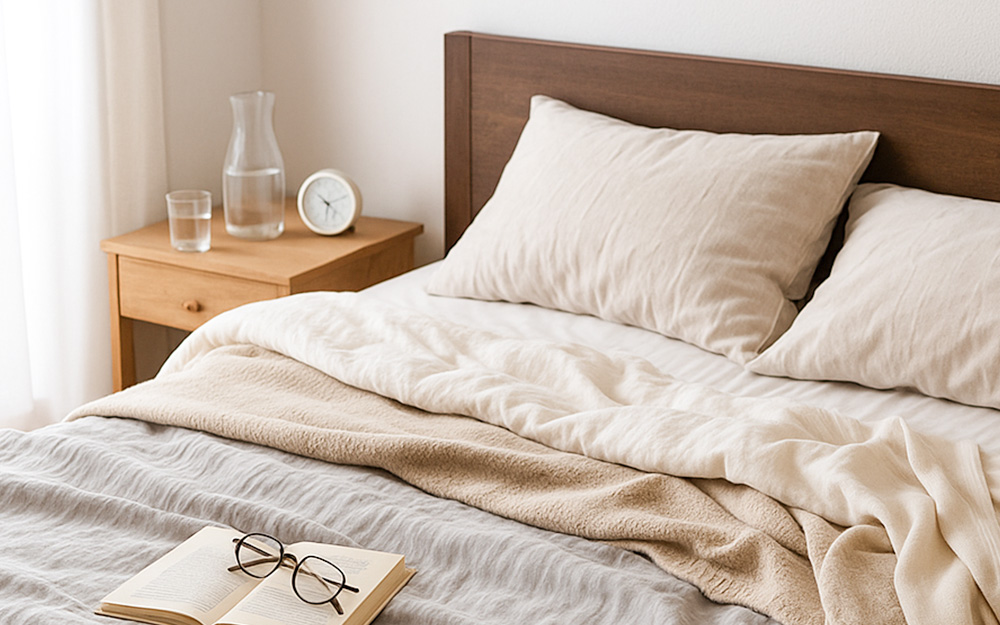 敷き寝具にも注意を払いましょう。夏用の冷感敷きパッドをまだ使っている場合は、綿素材の敷きパッドに変更することをおすすめします。また、マットレスの硬さが合わないと接触面の圧迫や回数の多い寝返りで“冷えを感じやすい”ことがあります。薄手のマットレストッパーを追加して体圧分散と保温感を調整することも効果的です。足元だけが冷える場合は、足元用の小さな湯たんぽや専用の足温器を使用すると、全身の血行が改善されて眠りやすくなります。