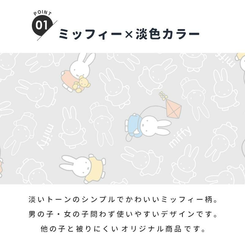 淡いトーンのシンプルでかわいいミッフィー柄。男の子・女の子問わず使いやすいデザインです。他の子と被りにくいオリジナル商品です。