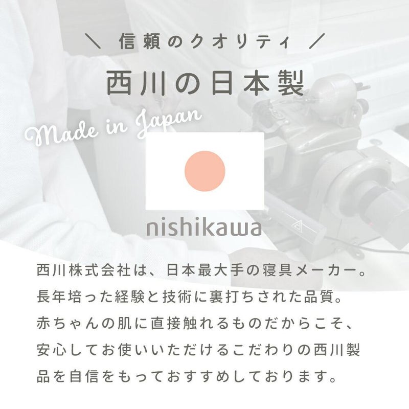 西川株式会社は日本最大手の寝具メーカー。長年培った経験と技術に裏打ちされた品質で、赤ちゃんの肌に直接触れるものだからこそ安心してお使いいただけます。