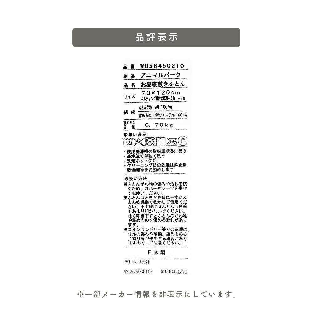 西川 洗える お昼寝敷き布団 70×120cm アニマルパーク 日本製 固綿入り