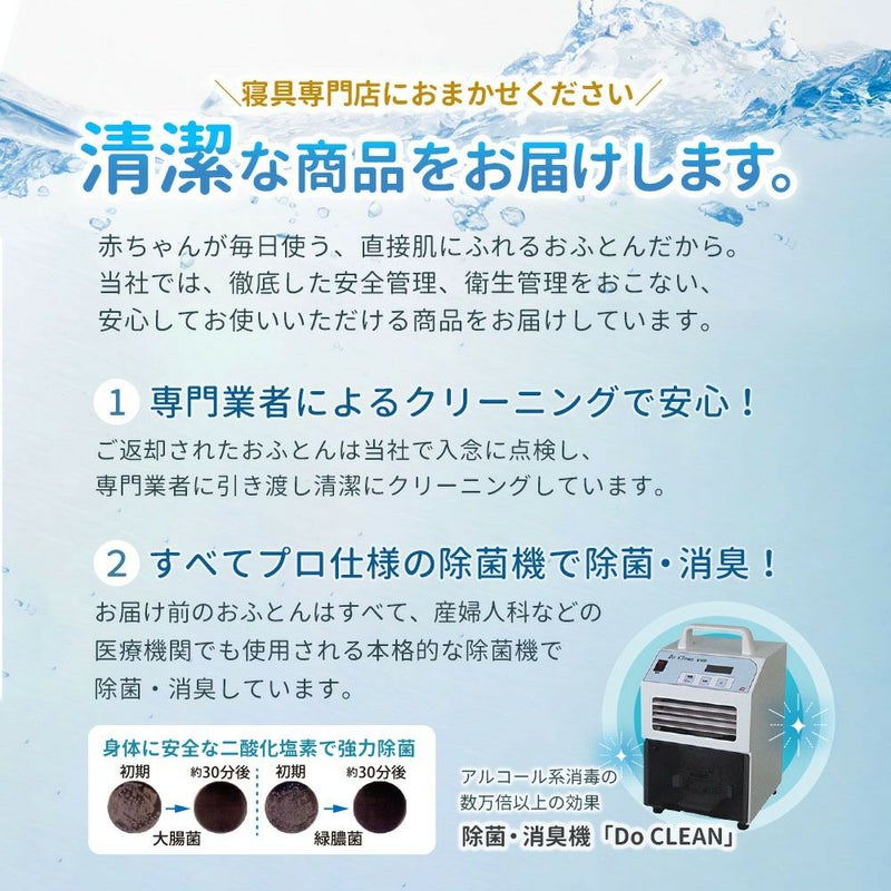 厚手と薄手の2つの掛けふとんで季節に合わせて使える便利なベビー布団セット。洗濯機でのお洗濯が可能で、いつだって清潔。※固わた敷きふとんは手洗いになります。カバー類は綿100%生地を使用しています。