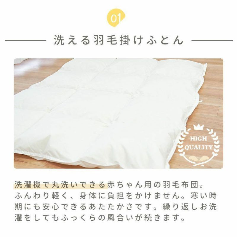 掛け布団は吸湿・発散性に優れ、軽くて暖かい羽毛の布団を採用!敷き布団はロングセラーのラジカル敷き布団。丈夫でへたりにくいウェーブ構造の固綿で赤ちゃんの背骨をしっかり支え、汗などの水分を素早く吸収発散!