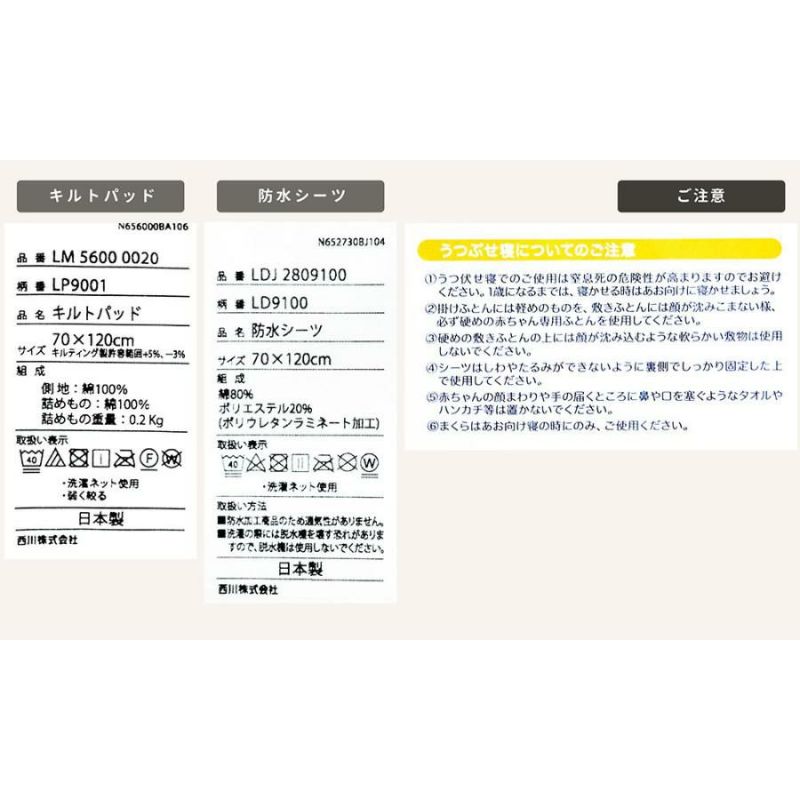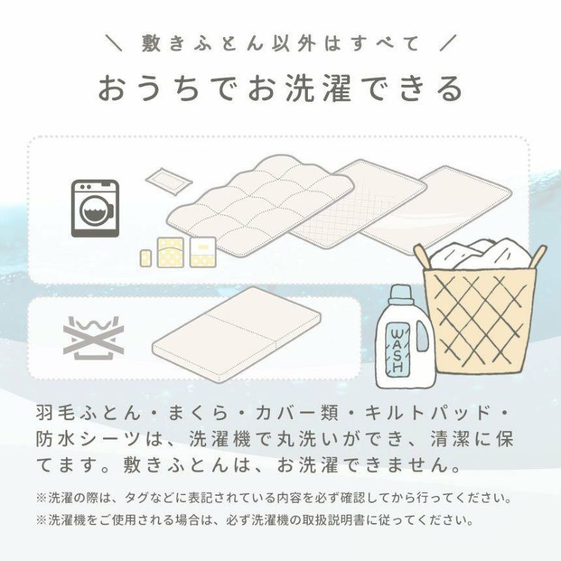 カバー類はすべてお肌にやさしいコットン100%。あると便利なキルトパッド、防水シーツも入った8点セット。敷き布団以外すべてお洗濯OK♪