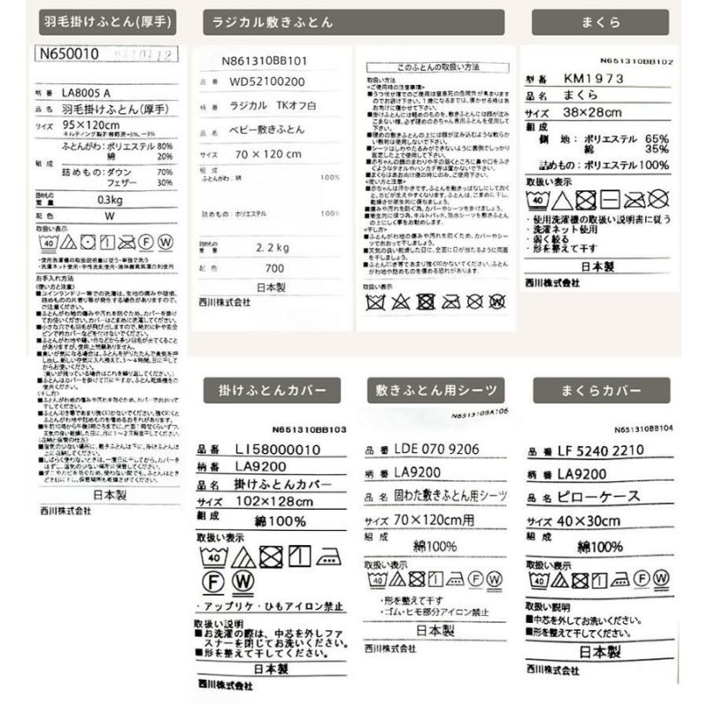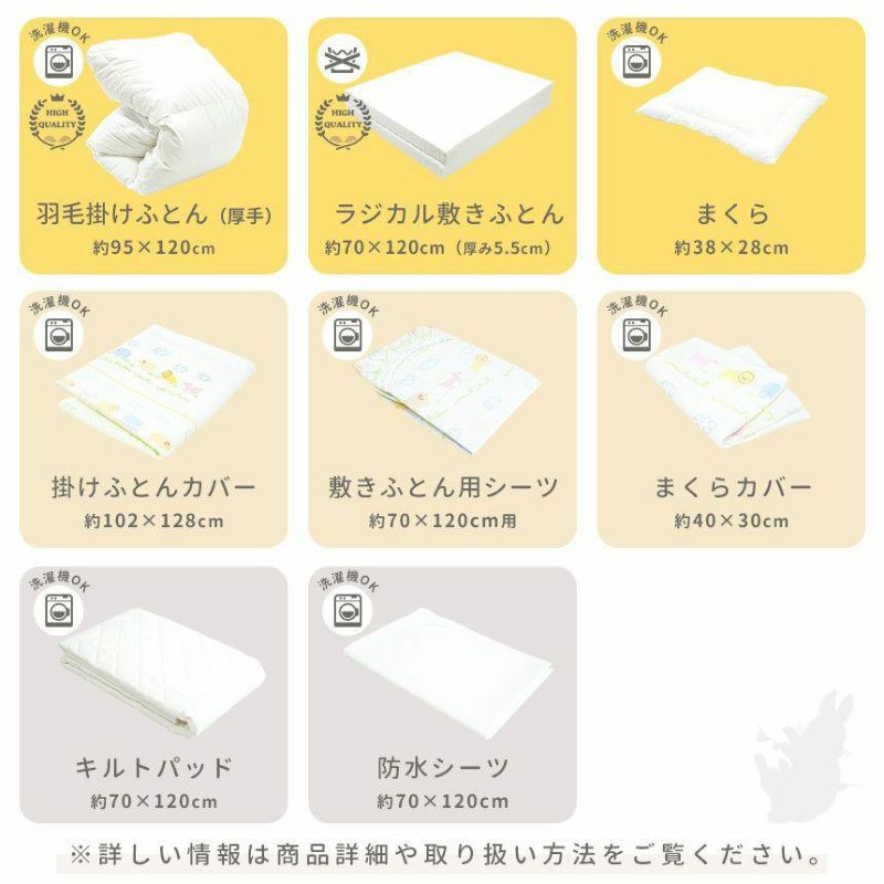 セット内容 羽毛掛けふとん / ラジカル敷きふとん / まくら / 掛けふとんカバー / 敷きふとん用シーツ / まくらカバー / キルトパッド / 防水シーツ