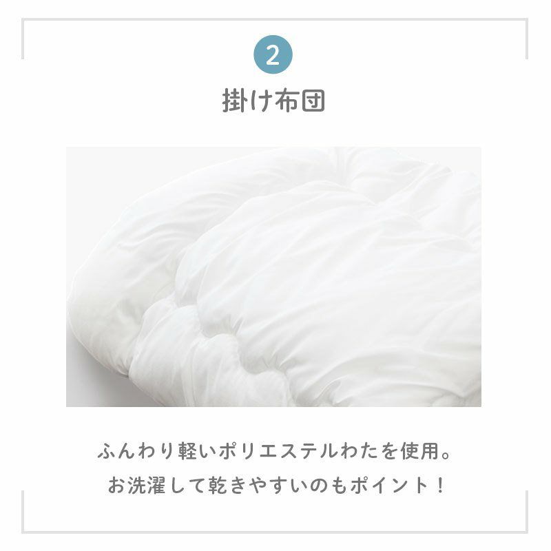 掛布団はホコリの出にくい合繊ポリエステルわた使用。