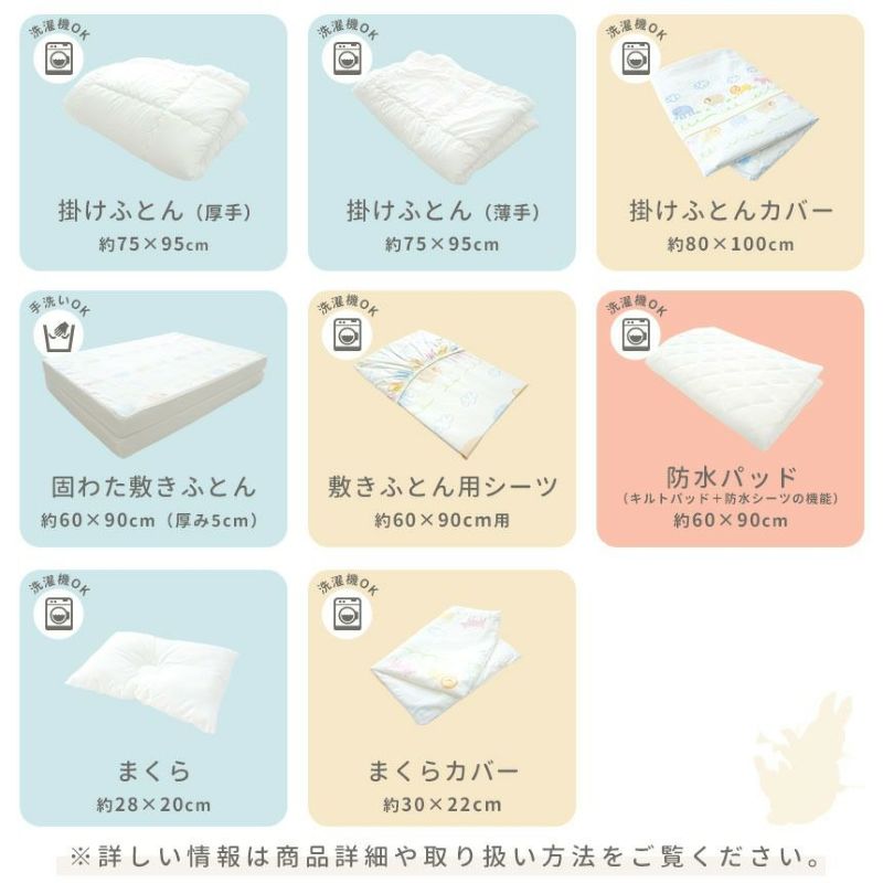 セット内容 掛けふとん(厚手) / 掛けふとん(薄手) / 固わた敷きふとん / まくら / 掛けふとんカバー / 敷きふとん用シーツ / まくらカバー / 防水パッド