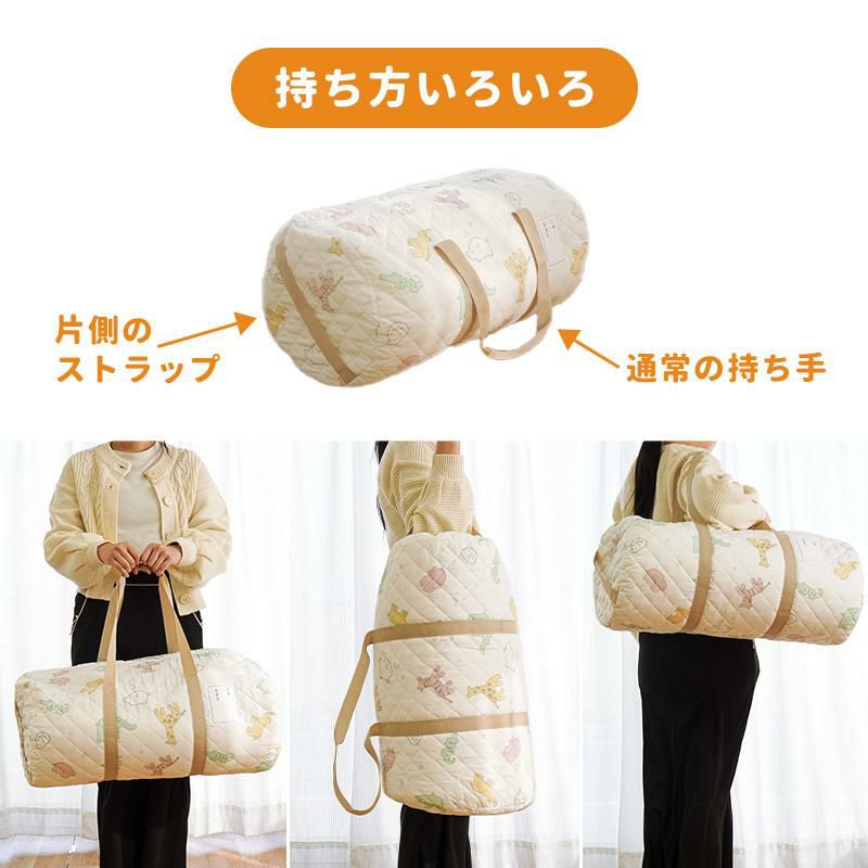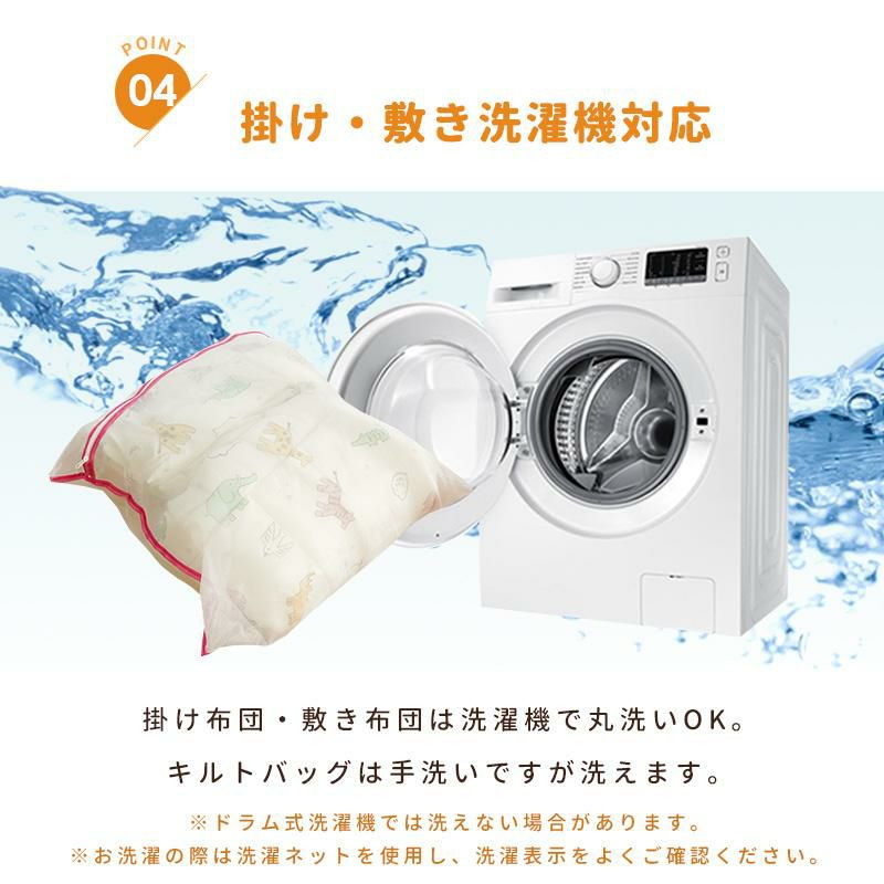 掛け布団・敷き布団は洗濯機で丸洗いOK。キルトバッグは手洗いですが洗えます。