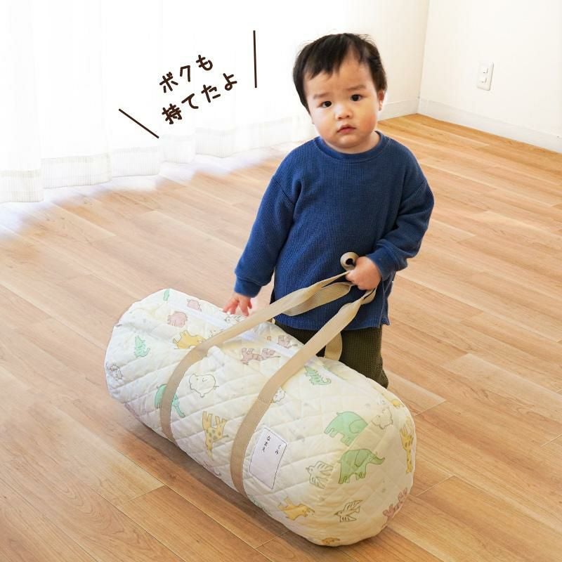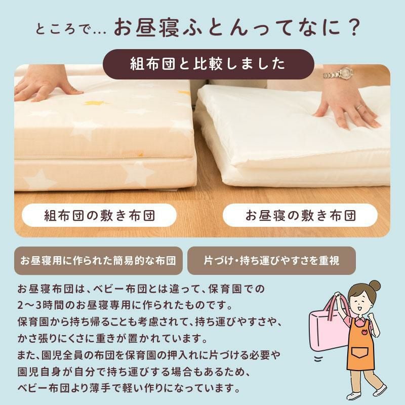 お昼寝布団は、ベビー布団やベビー布団セットとは違って、保育園、幼稚園、での2~3時間ぐらいのお昼寝専用に作られたものです。保育園・幼稚園から持ち帰ることも考慮されているので 持ち運びやすさや、かさはりにくさに重点が置かれています。また、園児全員の布団を保育園・幼稚園の押し入れに片付ける必要や園児自身が自分で持ち運びする場合もあるので、ベビー布団、ベビー布団セットよりも薄手で軽い作りになっています。
