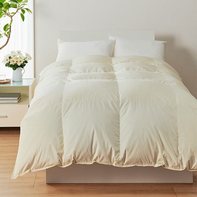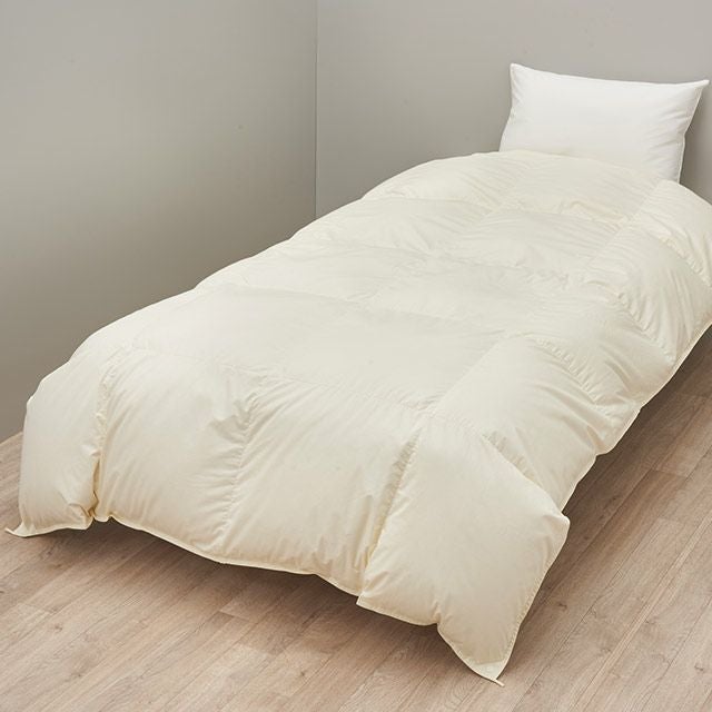 羽毛布団は天然素材の為、無臭ではありません。特に開梱直後や、温度・湿度の関係で臭いが強く感じられる場合もございます。その場合は、羽毛布団に空気を含ませるように数回揺らし、布団内の空気をゆっくり追い出してください。