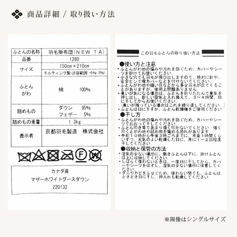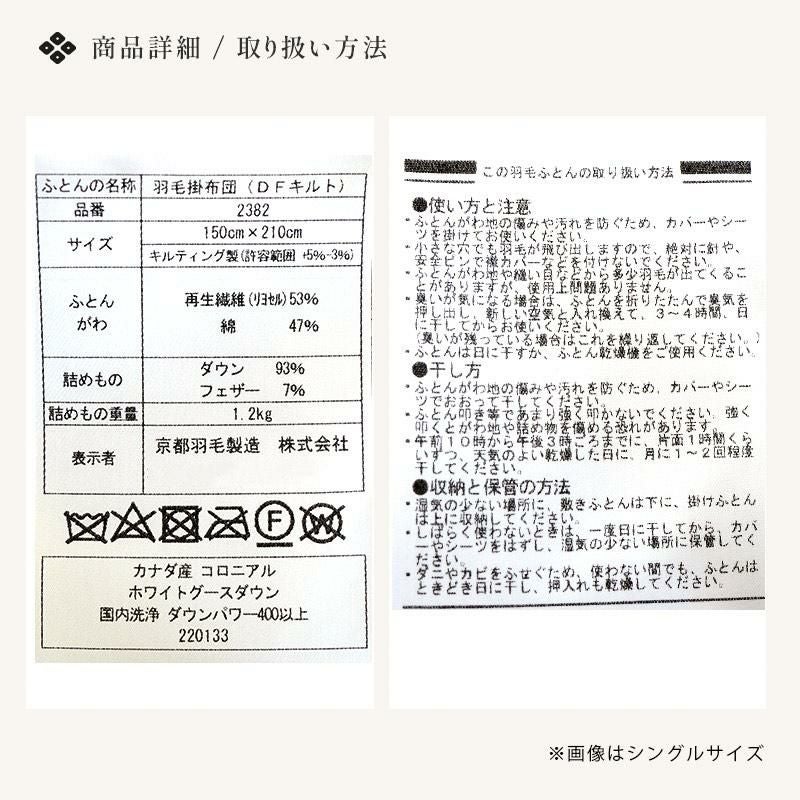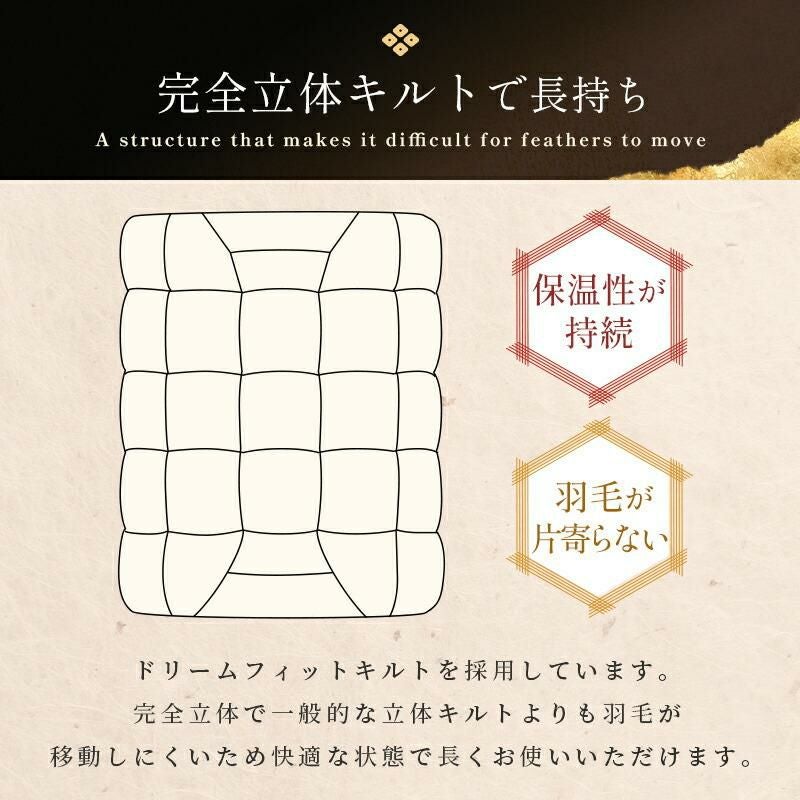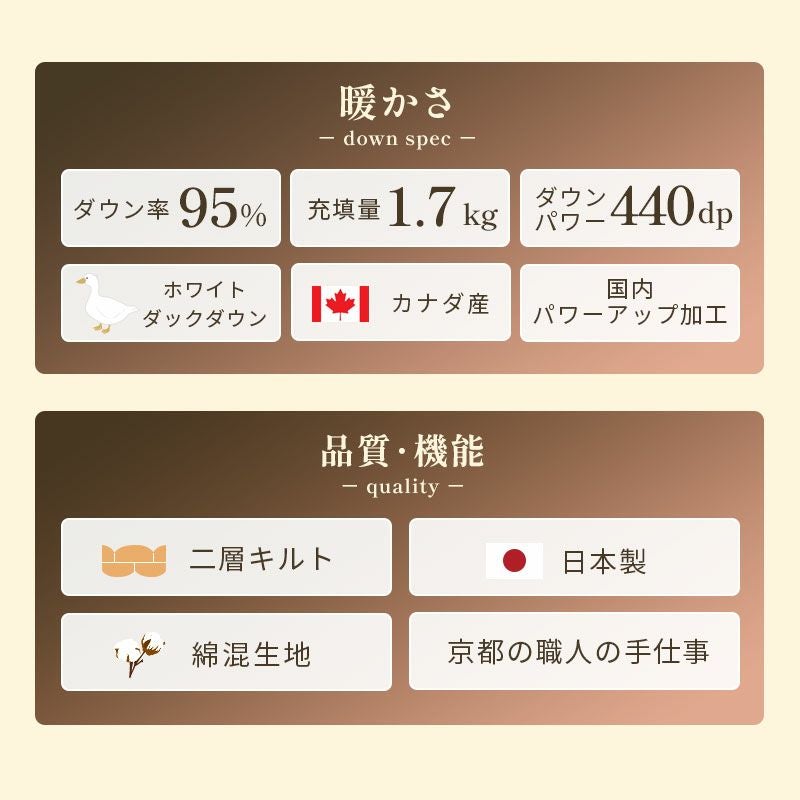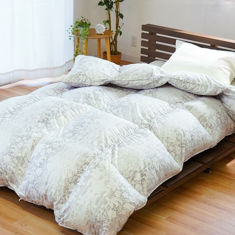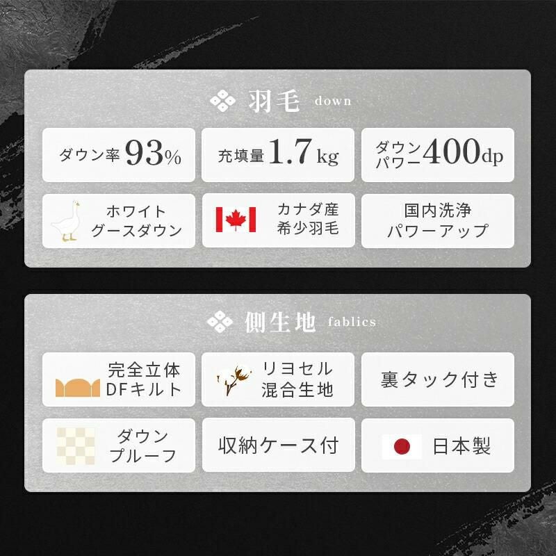 他の画像を見る 在庫切れ 即日発送 当社限定 京都羽毛 銀-shirogane- グースダウン93% 羽毛布団 ダブルロング 190×210cm ¥ 118,000 ¥ 81,800 税込 お気に入りに登録する