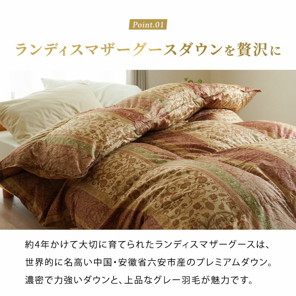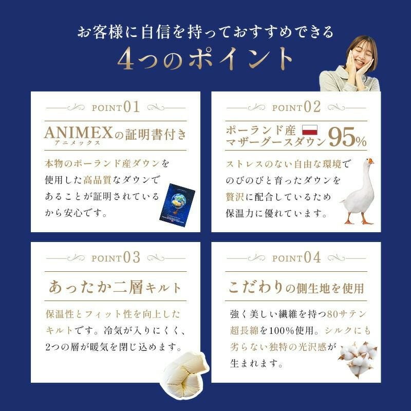 他の画像を見る 会員セール 二層キルト 羽毛布団 マザーグース ダウン95% 440dp ポーランド産 ダブル超ロング ANIMEX ¥ 243,000 税込 会員セール価格 ¥ 218,700 税込 お気に入りに登録する