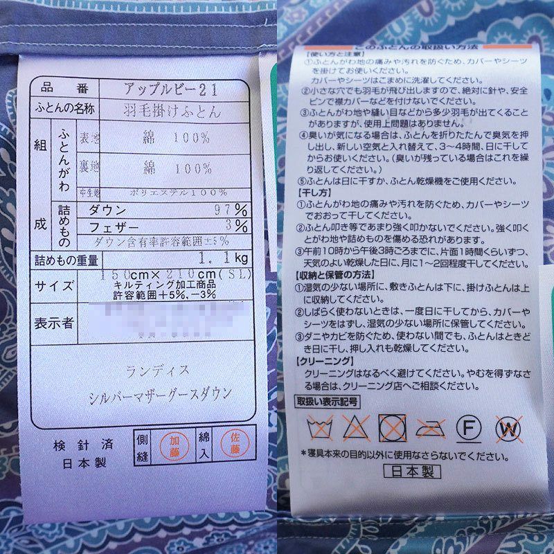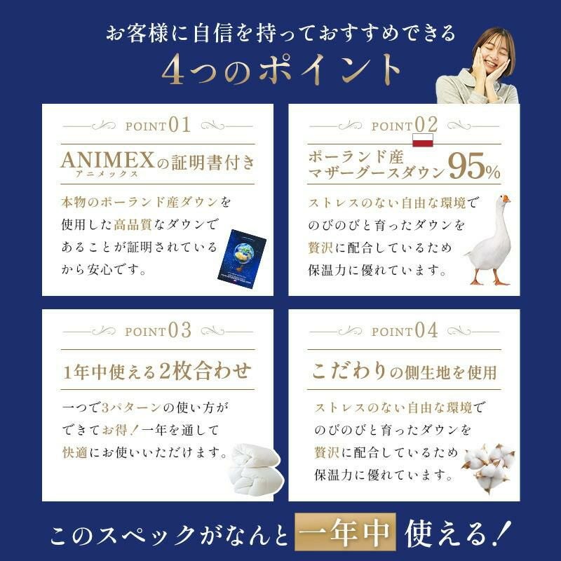 他の画像を見る 会員セール 1年中使える羽毛布団 2枚合わせ 羽毛布団 マザーグース ダウン95% ダブル ポーランド産 ANIMEX ¥ 240,000 税込 会員セール価格 ¥ 216,000 税込 お気に入りに登録する