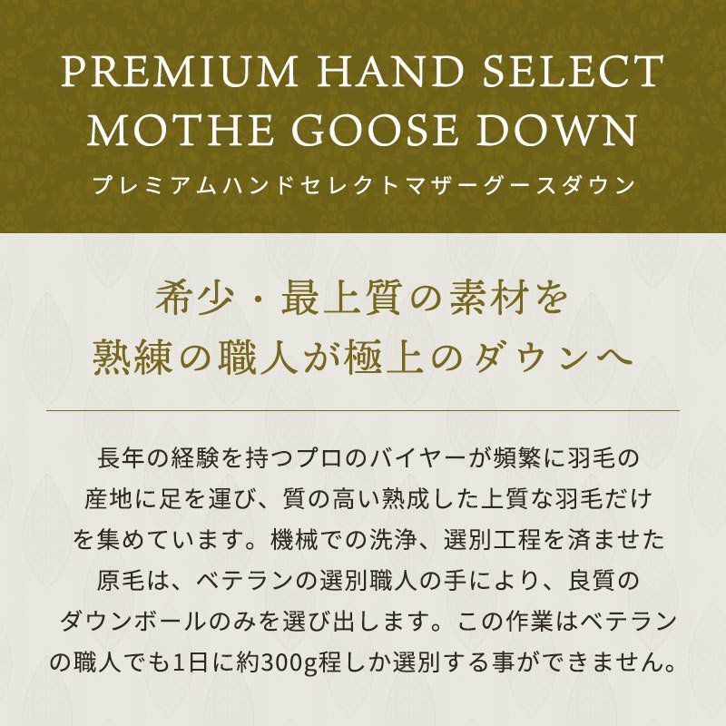 他の画像を見る 在庫切れ 【販売終了】プレミアムハンドセレクト マザーグース ダウン97% 羽毛布団 ダブルロング 190×210cm ¥ 168,000 税込 会員セール価格 ¥ 151,200 税込 お気に入りに登録する