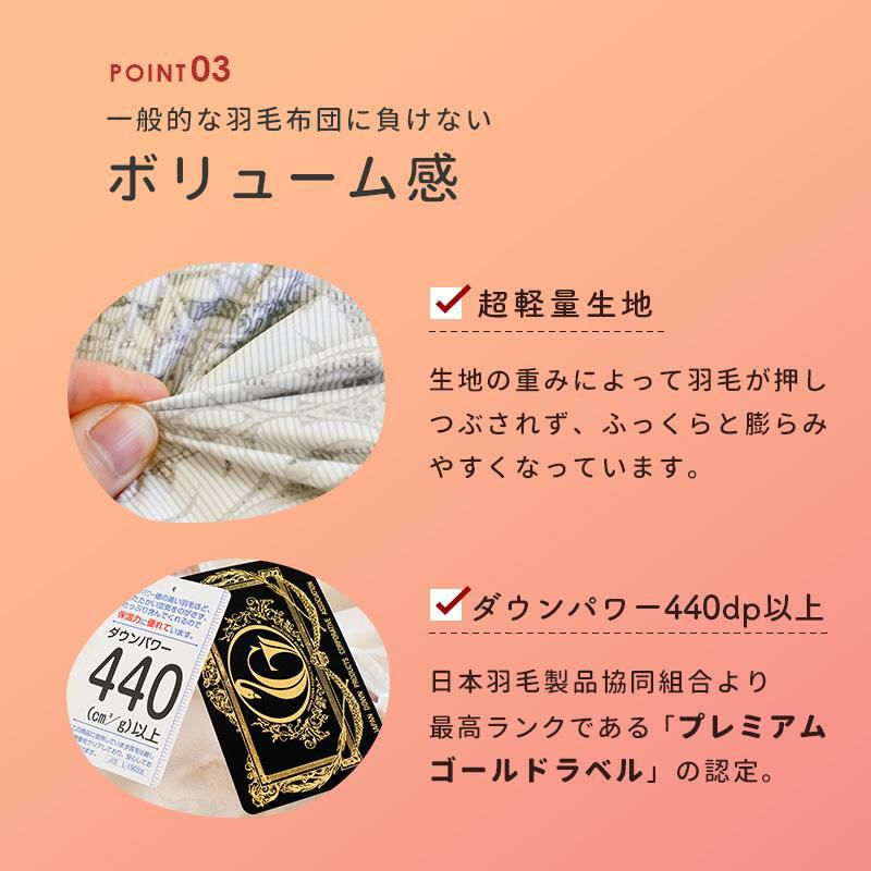 さらに、一般的な布団より約44%軽い、柔らかくて丈夫な超軽量生地を採用。身体へのフィット感に優れ、「とっても軽いのにあったか」を実現しました。