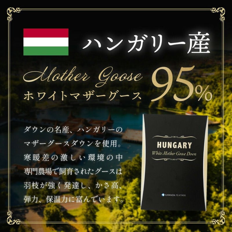 寒暖差が厳しく肥沃な土壌を持つハンガリーのグース専門農場で飼育されたマザーグースダウンを贅沢に95%配合。さらに、世界最高水準の洗浄力を持つ「河田フェザー」により、国内の超軟水で羽毛を洗浄。中の羽毛にSEK抗菌防臭マークを取得しています。