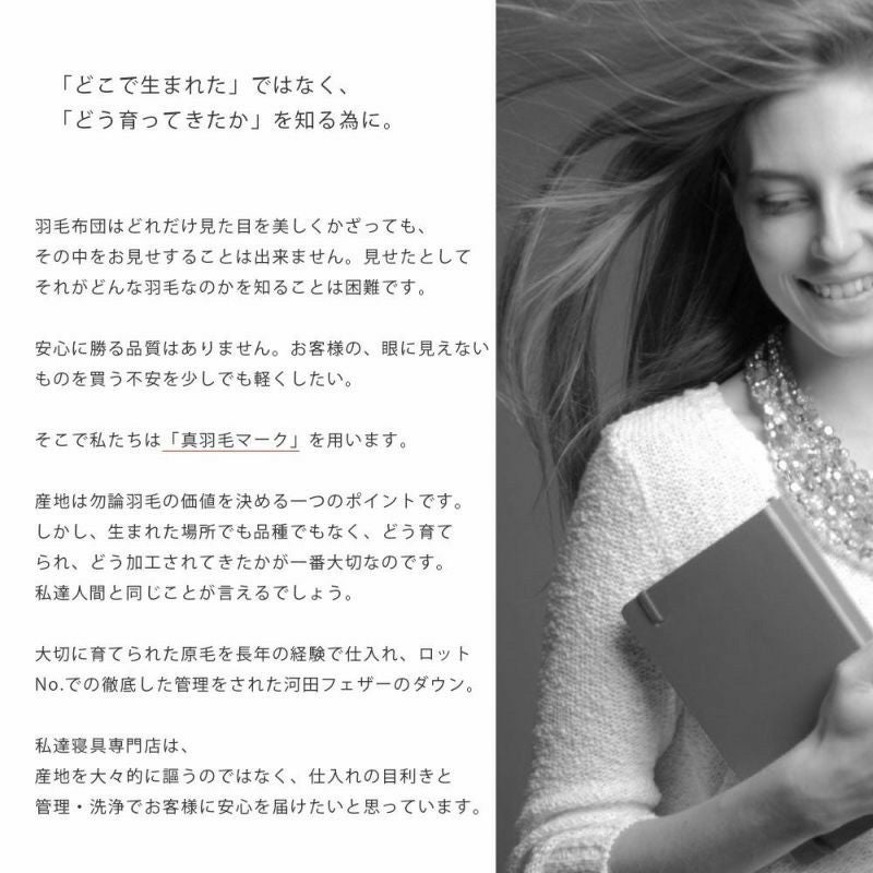 大切に育てられた原毛を長年の経験で仕入れ、ロットNo.での徹底した管理をされた河田フェザーのダウン。 私達寝具専門店は、産地を大々的に謳うのではなく、仕入れの目利きと管理・洗浄でお客様に安心を届けたいと思っています。
