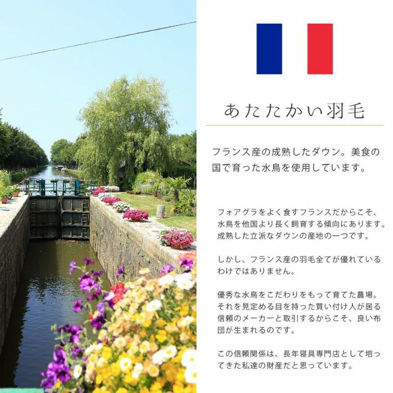 フォアグラをよく食すフランスだからこそ、水鳥を他国より長く飼育する傾向にあります。成熟した立派なダウンの産地の一つです。しかし、フランス産の羽毛全てが優れているわけではありません。
