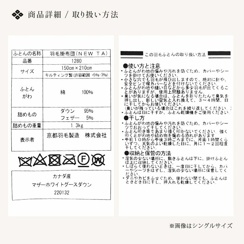 4. 京都羽毛 カナダ産 マザーグース ダウン95% 羽毛布団 クイーンロング 210×210cm 松