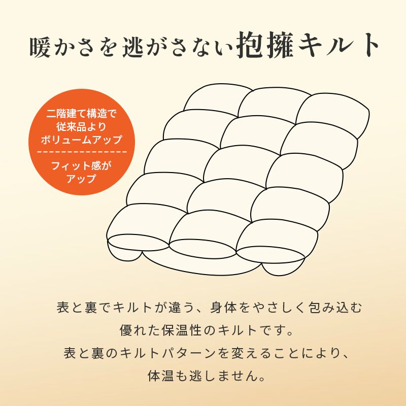 表と裏でキルトが違う、身体をやさしく包み込む優れた保温性のキルトです。表と裏のキルトパターンを変えることにより、体温も逃しません。