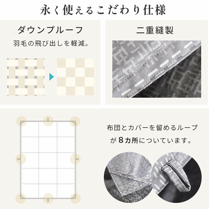 羽毛布団の側生地と掛け布団カバーの素材にポリエステルが含まれている場合、摩擦によってカバー内部で毛玉やホコリが発生する原因となります。