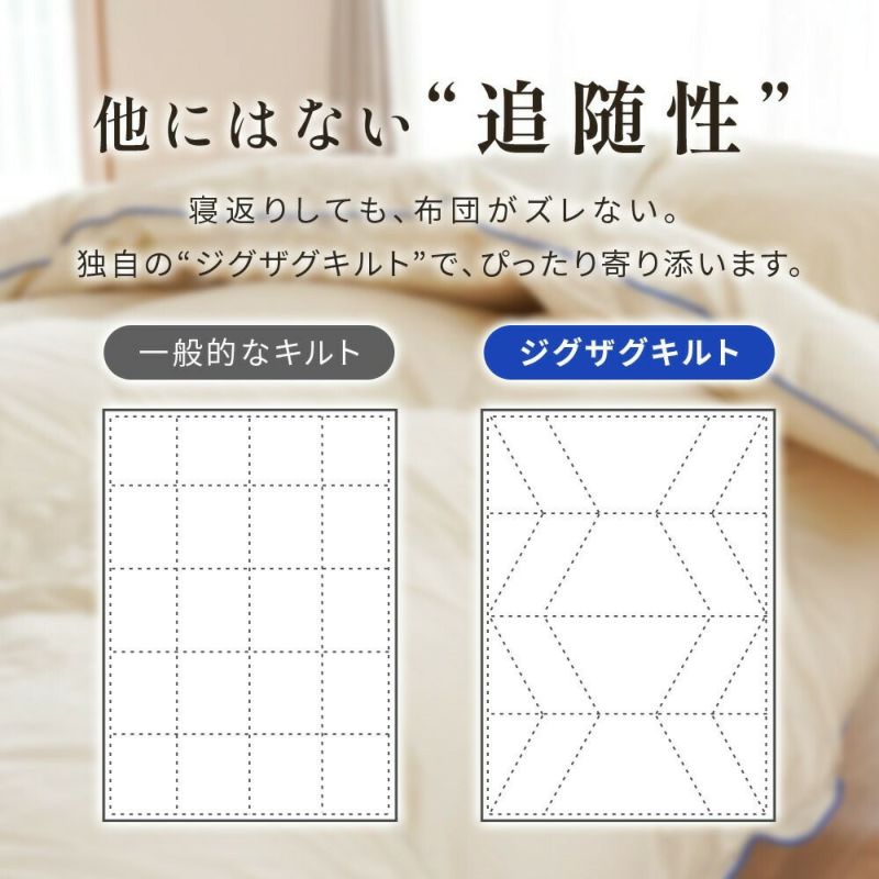 特殊ジグザグキルトが寝返りにしなやかに追随。ズレも隙間も防ぎ、冷気を遮って朝までぬくもりをキープ