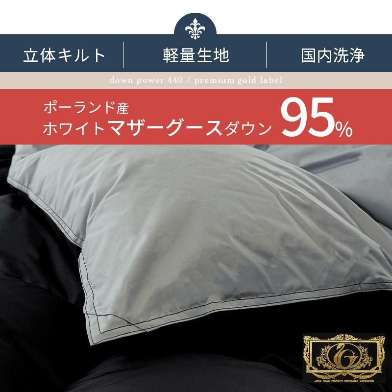 日本羽毛製品協同組合より5段階中の最高ランクである「プレミアムゴールドラベル」の認定を得た商品です。日本羽毛製品協同組合とは、日本国内における羽毛製品メーカーなどが加盟する組合です。羽毛布団を製造しているメーカーの大多数(100社以上)が加盟しています。