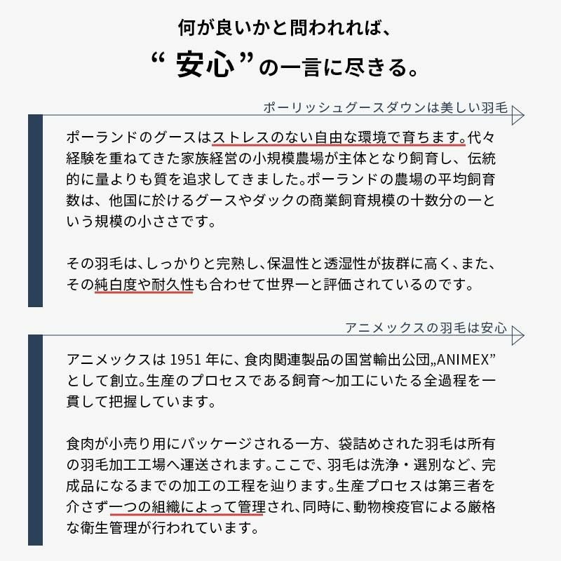 国土面積のうち、農地の占める面積はなんと約42%。ライ麦の生産量は世界一、ベリー類等も世界最大輸出量。そんなポーランドの豊かな自然の中で育った水鳥は、欧州の中でも特に人気の産地の一つです。産地が全てを決めるわけではありませんが、同国産羽毛の多くが日本向けに採取されていますので、日本人好みのクオリティが期待されています。