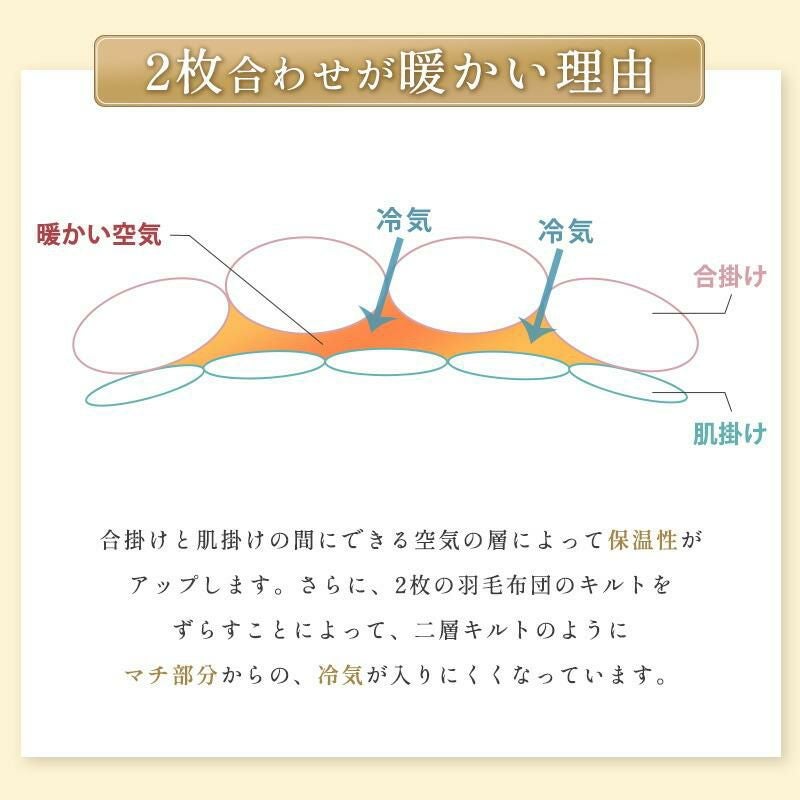 合掛けと肌掛けの間にできる空気の層によって保温性がアップします。さらに、2枚の羽毛布団のキルトをずらすことで二層キルトのように肌沿いが良くなり、冷気が入りにくくなっています。