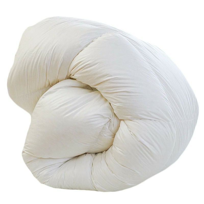 側生地の表側に天然素材の80超長綿、裏面(中身側)にポリエステルを使用した新合繊素材を使用しています。綿100%の側生地に比べて軽量に仕上がっているため、より羽毛のかさが出るようになっています。