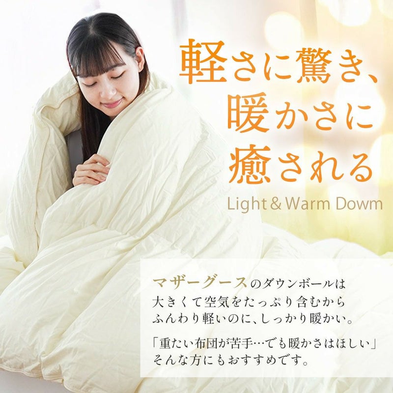 少し厚手の合掛け布団と薄手の肌掛け布団がセットになった2枚合わせの羽毛布団。1枚づつ使うこともできて経済的。収納する際もかさばりにくいのが嬉しいポイント!