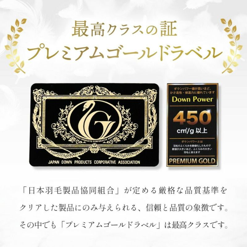 ダウンパワー450dp以上、プレミアムゴールドラベル付き!世界最高水準・河田の「真羽毛」。素材良し・洗浄良し。暖かく、においの少ない羽毛布団をお求めの方に。