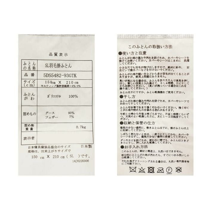 詰め物:グース93% フェザー7%
