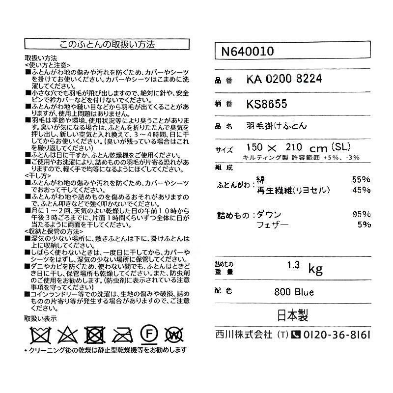 5. 西川 NISHIKAWA DOWN 手選別 ドイツ産 マザーグースダウン95% 羽毛布団 シングルロング 150×210cm【カバー付】