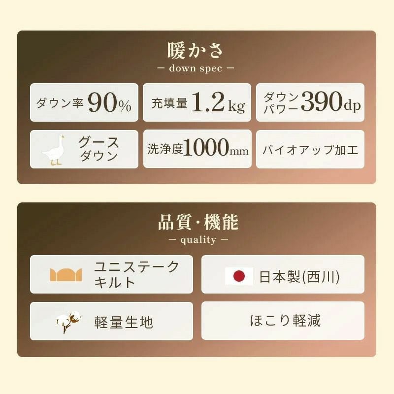 厳選したグースダウンを贅沢に配合。ダウン率は90%、ダウンパワーは390dp以上!ダックよりも体の大きいグースはダウンボールが大きく丈夫。羽毛特有のニオイも少なく、より長くふっくらとした状態でお使いいただけます。