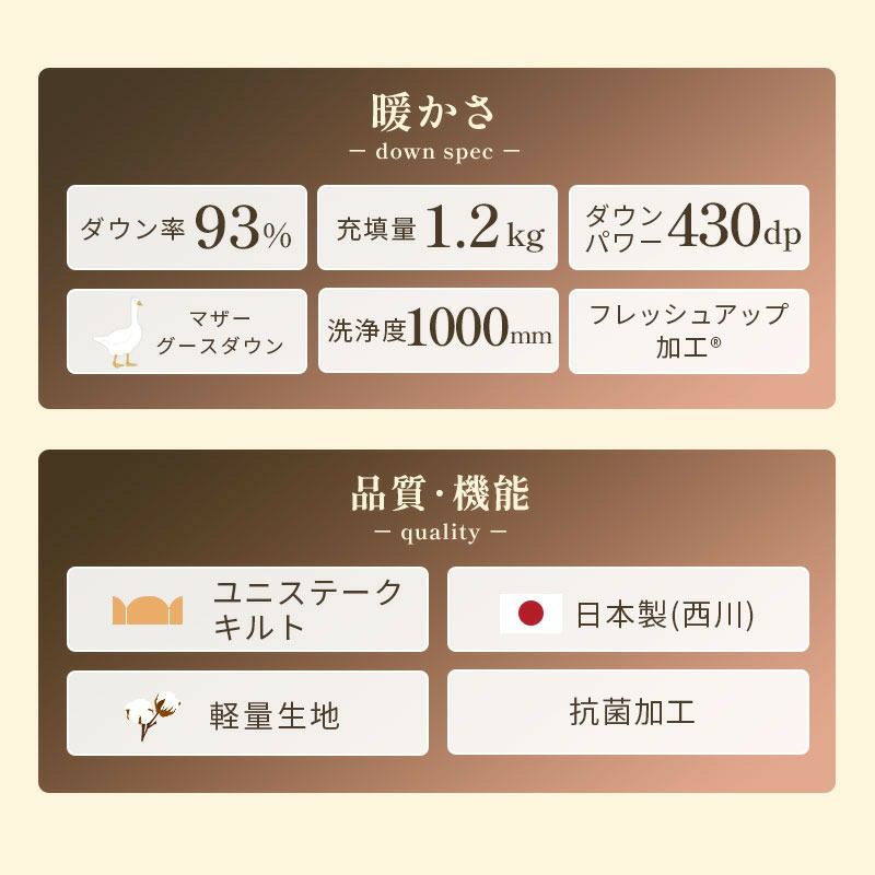 また、一粒一粒が大きく成熟したマザーグースダウンを使用しています。成長した親鳥から採取されるダウンは、一粒一粒が大きく暖かい空気をたっぷり含むため、保温力抜群です。