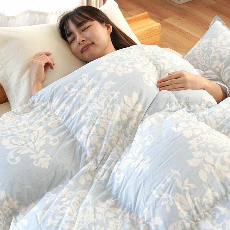 軽くて丈夫なポリエステル繊維にコットンを配合して吸湿性をプラスしています。生地が軽いので、羽毛のふくらむ力を遮らず、ふっくらとした布団に仕上がります。お洒落なオーナメント柄2カラーよりお選びいただけます。