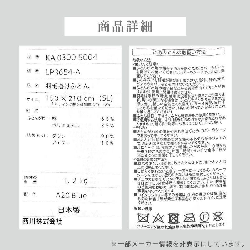 しっかり綺麗に磨かれた、西川自慢の上質なダウンをたっぷり1.2kg詰め込みました。ふんわり軽い羽毛は、たったの0.1kg違うだけで、ボリュームに差がでてきます。 より満足していただける暖かさにするため、少しお高いけれど買ってよかったと思っていただけるような品質と価格に妥協しないこだわりが詰まっています。