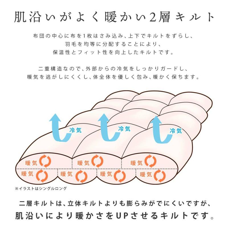 さらに、羽毛布団の上下でキルトのマスをずらした「2層式キルト」により、羽毛内部に蓄えた暖かい空気を逃がしにくく、保温性に優れています。中生地があるため一般的な立体キルトよりも重くなり、布団が膨らみにくいという欠点はありますが、羽毛の偏りも少なく身体への密着度がアップしました。