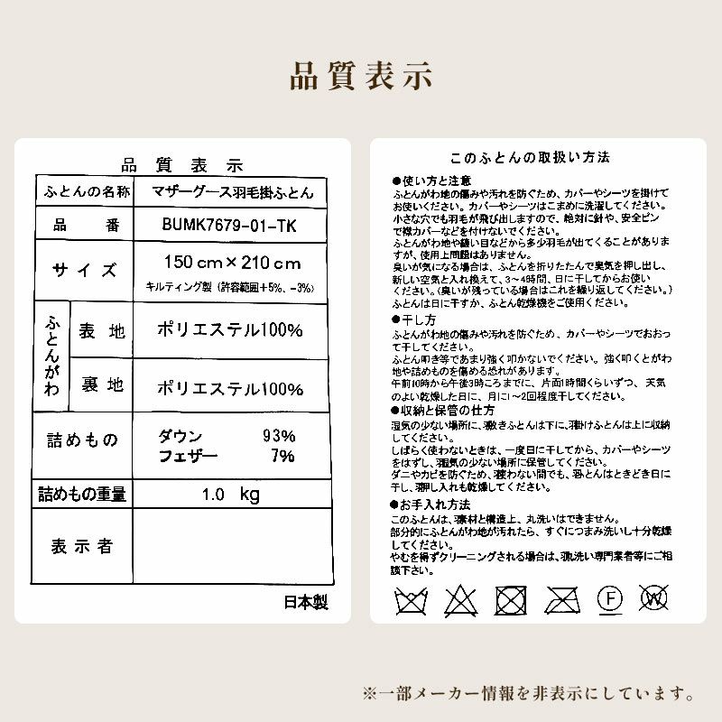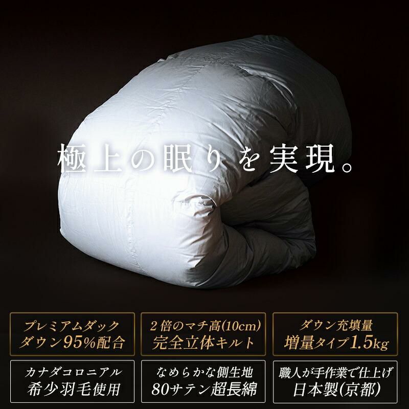 他の画像を見る 在庫切れ 即日発送 当社限定 京都羽毛 京都職人の羽毛布団 シングル ダウン85% 京都羽毛 初 (うい) 増量1.2kg 150×210cm 4.00 ¥ 16,800 税込 お気に入りに登録する
