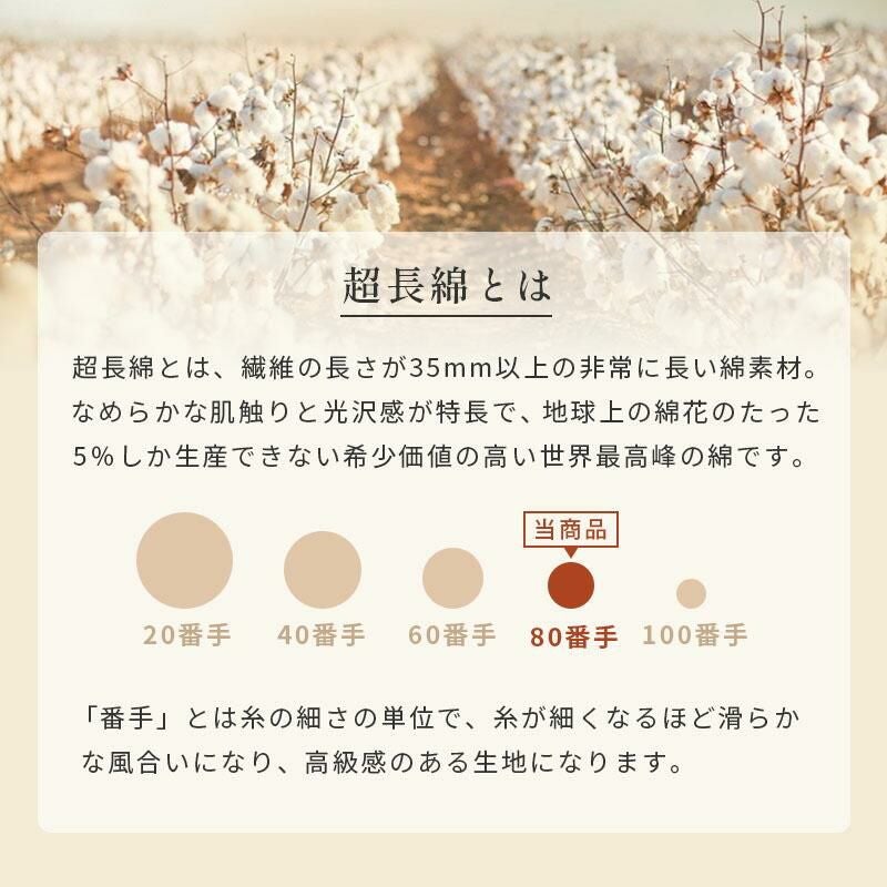 超長綿は綿花からとれる非常に長い繊維で、地球上の綿花のたった5%しか生産できない希少価値の高い綿素材です。肌触りが良く、吸湿性に優れた綿は羽毛布団と相性の良い素材。超長綿は通常の綿より繊維が長く、ソフトでしなやか、さらに吸湿性や通気性に優れています。80番手の糸を使用したとてもやわらかな生地です。