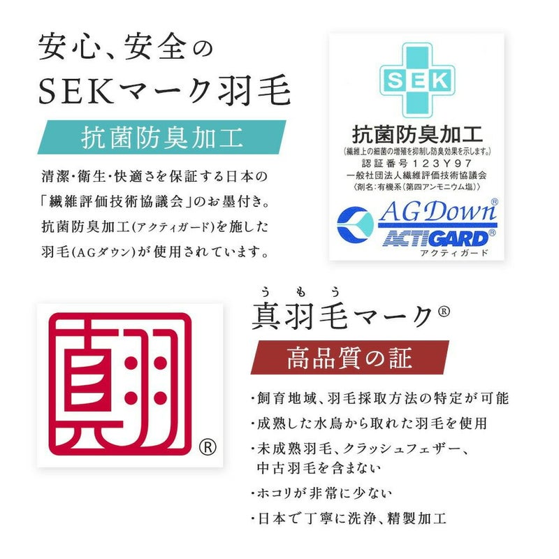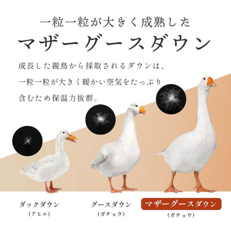 寒暖差が厳しく肥沃な土壌を持つハンガリーのグース専門農場で飼育されたマザーグースダウンを贅沢に95%配合。さらに、世界最高水準の洗浄力を持つ「河田フェザー」により、国内の超軟水で羽毛を洗浄。中の羽毛にSEK抗菌防臭マークを取得しています。