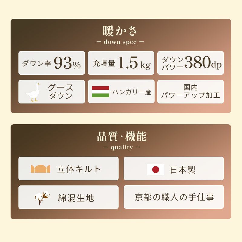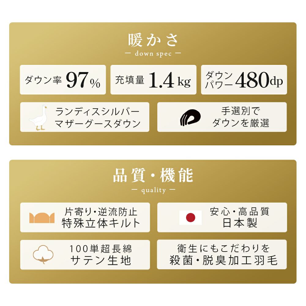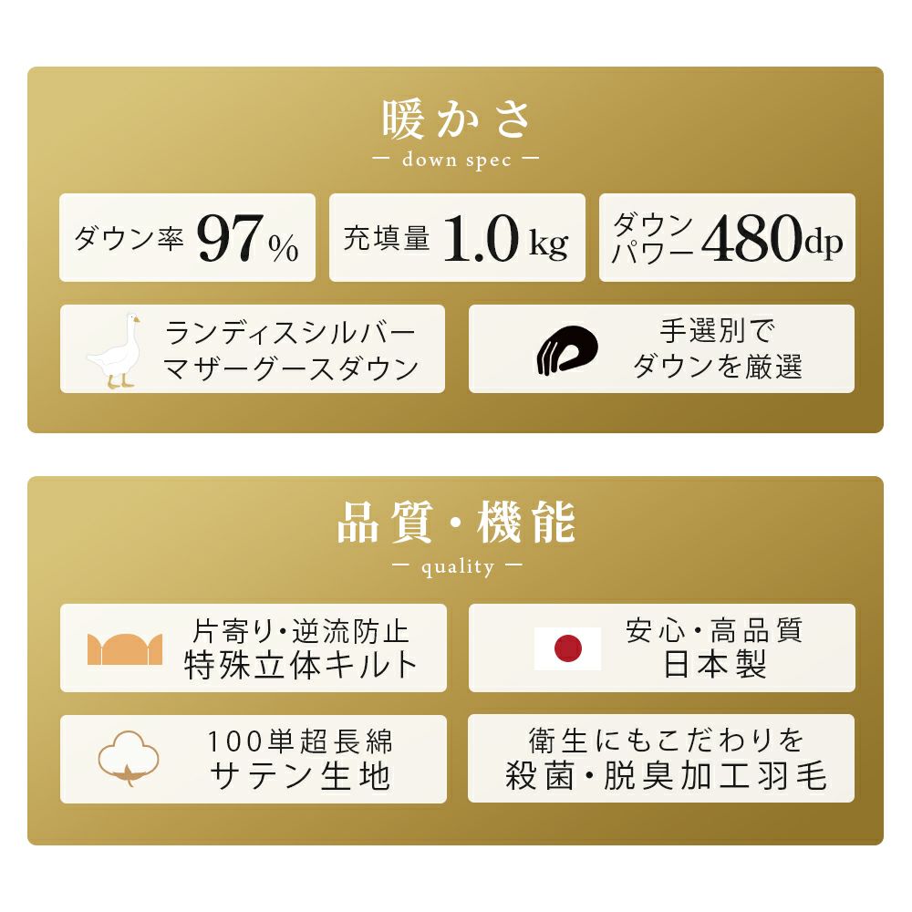 他の画像を見る 会員セール 1年中使える羽毛布団 羽毛布団 2枚合わせ ポーランド産 グース ダウン93% 超長綿 60サテン ダブル ¥ 118,800 税込 会員セール価格 ¥ 106,920 税込 お気に入りに登録する