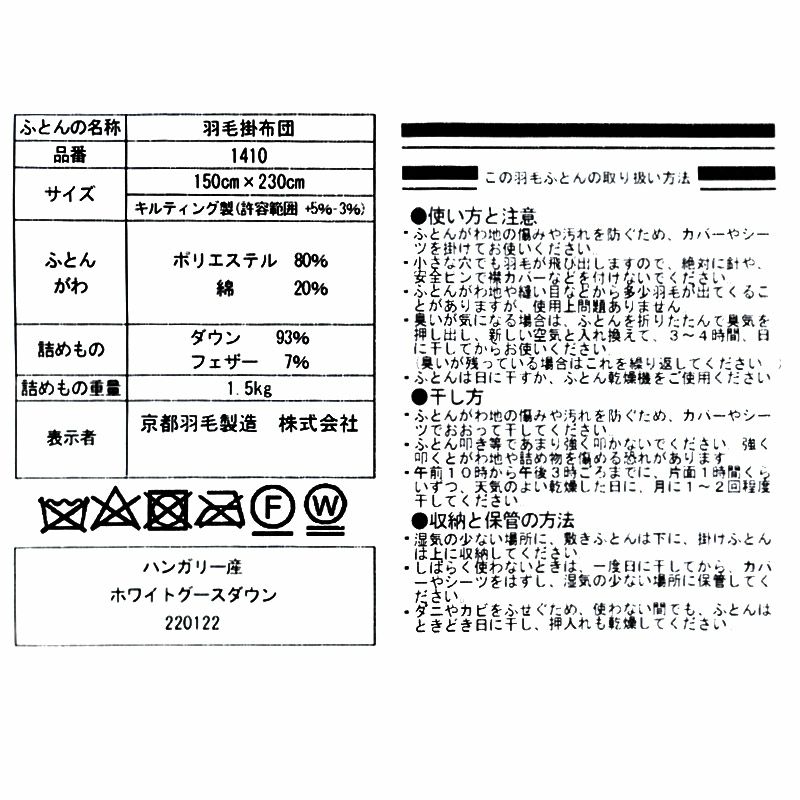 他の画像を見る 即日発送 会員セール 羽毛布団 ポーランド産 マザーグース95% シングルロング 150×210cm ¥ 118,000 税込 会員セール価格 ¥ 106,200 税込 お気に入りに登録する
