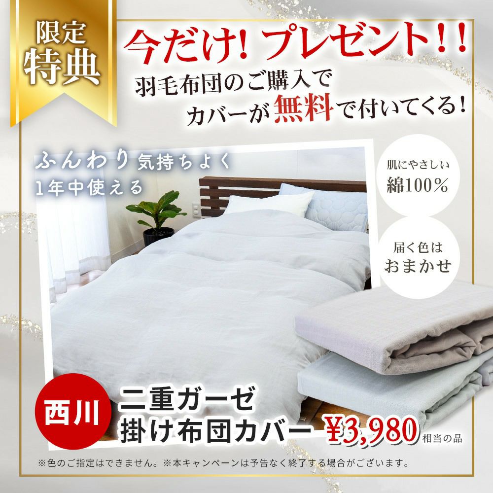 他の画像を見る 即日発送 当社限定 アフターサービス 安心アフターサービス対応 ★西川のカバープレゼント 京都羽毛 竹 カナダ産 マザーグースダウン95% 羽毛布団 シングルロング 150×210cm ¥ 308,000 ¥ 168,000 税込 お気に入りに登録する