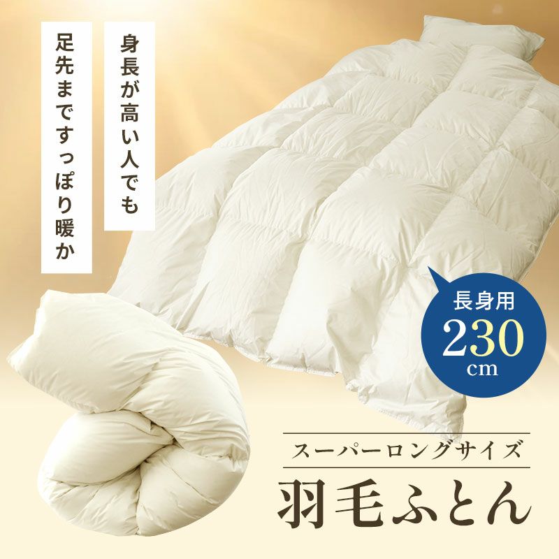 身長180cm以上の方にオススメ!丈230cmで足先まですっぽり暖か、スーパーロングサイズの羽毛布団。