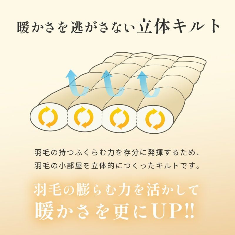 この羽毛はスタンダードにしてハイクオリティの「立体キルト」仕上げ。羽毛が存分にその実力を発揮できるように、羽毛の為の小部屋を作ったキルトです。