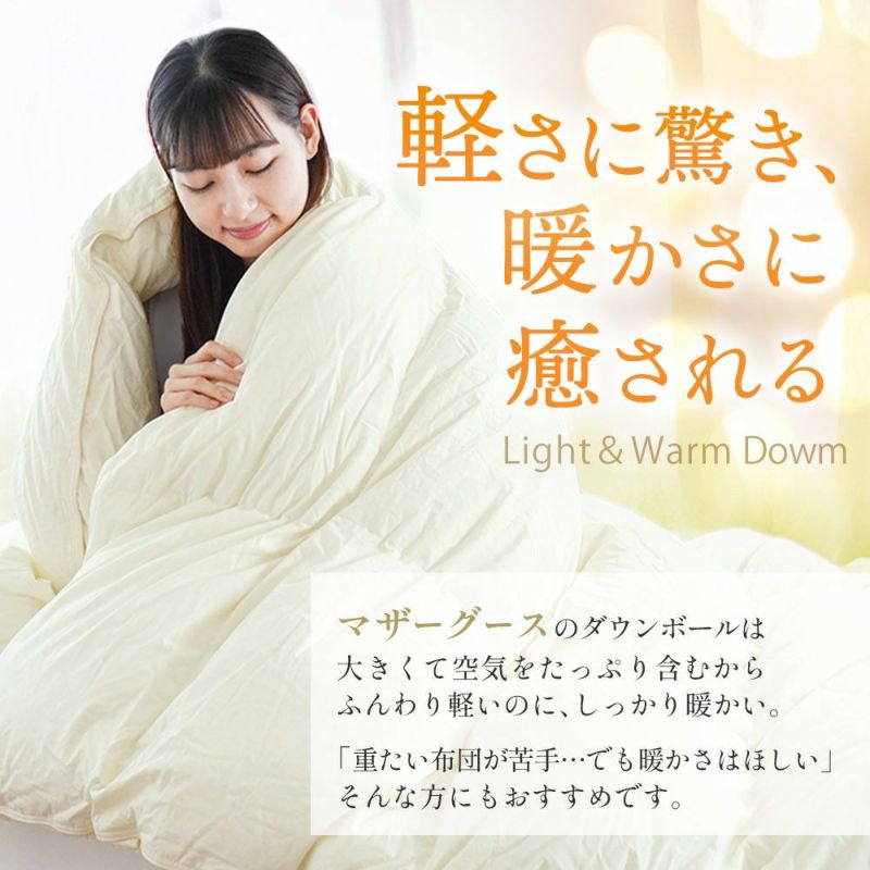 そんなダウンをリッチに95%配合。成熟したダウンボールは大きくたっぷりと空気を含み、軽くて暖かい羽毛布団が実現します。