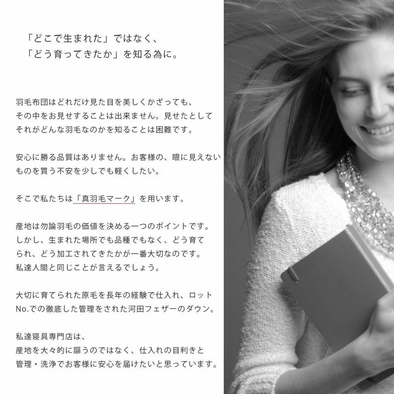 羽毛布団はどれだけ見た目を美しくかざっても、その中をお見せすることは出来ません。見せたとして、それがどんな羽毛なのかを知ることは困難です。安心に勝る品質はありません。お客様の、眼に見えないものを買う不安を少しでも軽くしたい。そこで私たちは「真羽毛マーク」を用います。産地は勿論羽毛の価値を決める一つのポイントです。しかし、生まれた場所でも品種でもなく、どう育てられ、どう加工されてきたたが一番大事なのです。私たち人間と同じことが言えるでしょう。