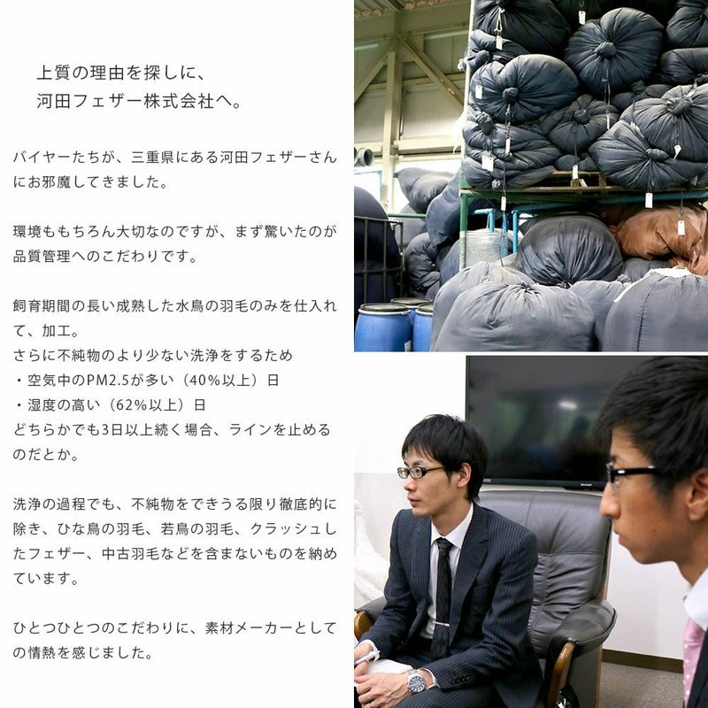 世界でもトップクラスの洗浄力を持つ「河田フェザー」のグースダウンを使用したワンランク上の羽毛布団「グレース」。その上質さの理由を探しに、当社のバイヤーたちが三重県にある河田フェザー株式会社にお邪魔してきました。