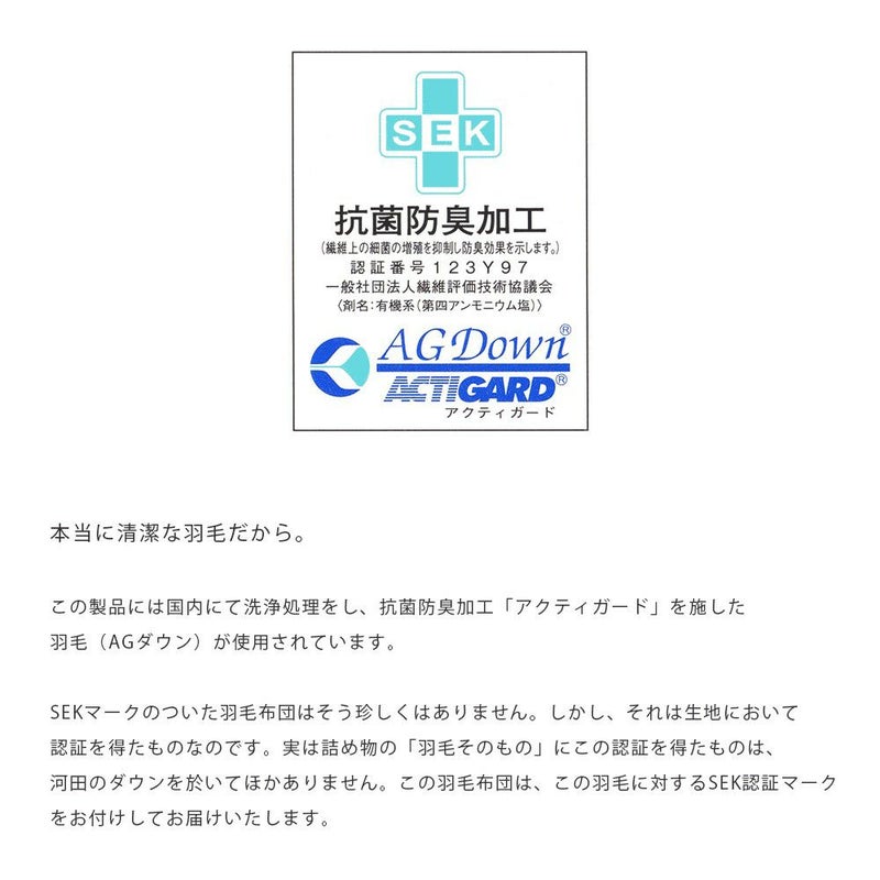 この製品には国内にて洗浄処理をし、抗菌防臭加工「アクティガード」を施した羽毛(AGダウン)が使用されています。 SEKマークのついた羽毛布団はそう珍しくはありません。しかし、それは生地において認証を得たものなのです。実は詰め物の「羽毛そのもの」にこの認証を得たものは、河田のダウンをおいて他にありません。この羽毛布団は、この羽毛に対するSEK認証マークをお付けしてお届けいたします。本当に清潔な羽毛だからです。